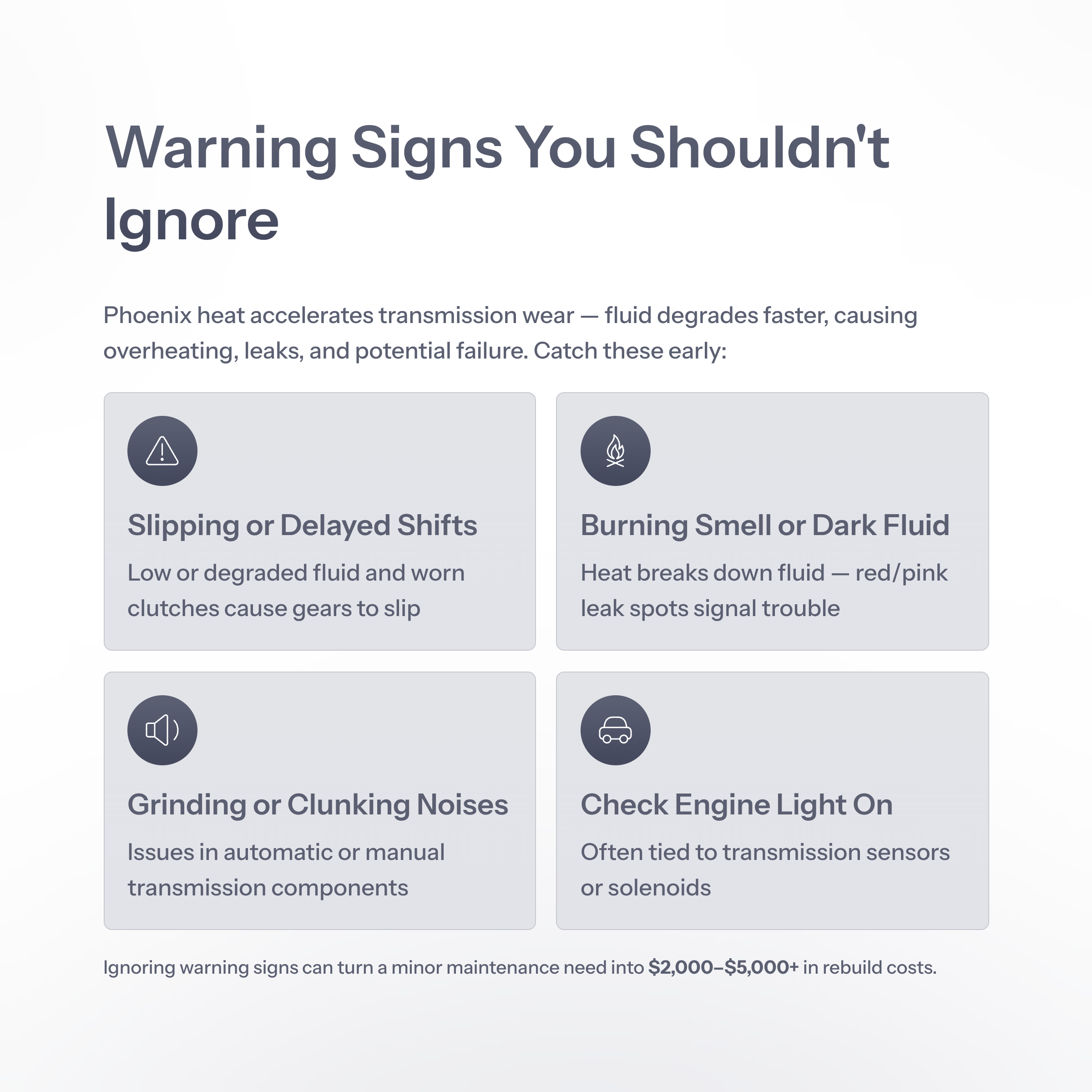 - Shuddering, overheating, or erratic performance — common in Phoenix due to transmission fluid breakdown.